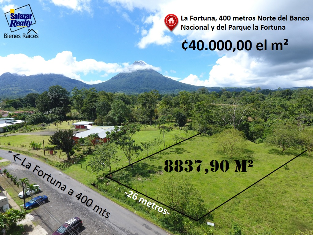 For Sale Land of 8837.90 m² at only ¢ 40,000.00 m², located 400 meters North of the National Bank of Costa Rica La Fortuna.