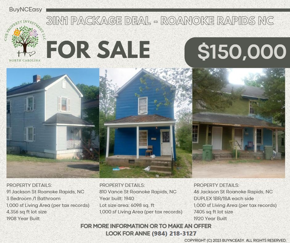 Feasibly one of the most underrated markets in the state, a market where landlords routinely make way more than the 1% rule. With some vision, you could own 3 properties for $150,000 while they last. An amazing investment opportunity, get in ahead of the crowd. You’re just a call away! Current Lease income $2,275/month! Property Details *810 Vance St Roanoke Rapids, NC This two-storey Residential property type is currently rented at $675 per month located at 810 Vance St Roanoke Rapids, NC. A cozy 3- bedroom, 1 bathroom home, you can polish and renovate it for a more pleasant look. OTHER DETAILS: Year built: 1940 Lot size area: 6098 sq. ft 1,000 sf Living Area (per tax records) Asking Price: $60,000 Currently Rented: $675/month Non- Refundable EMD: $3,000 Closing within 2 weeks of contract Cash or Hard Money Only At the time of this message, Rentometer says rent should be $813/month PROPERTY DETAILS : 3 Bedroom /1 Bathroom 1,000 sf Living Area (per tax records) 6,098 sq ft lot size 1940 Year Built Asking Price: $60,000 Currently Rented: $675/month Non- Refundable EMD: $3,000 Closing within 2 weeks of contract Cash or Hard Money Only At the time of this message, Rentometer says rent should be $813/month 46 Jackson St Roanoke Rapids, NC This Duplex Residential property type is currently rented at $1100 per month located at 46 Jackson St., Roanoke Rapids, NC. A cozy 1-bedroom, 1 bathroom home in each side, you can renovate and reinstate it for a more satisfying look. OTHER PROPERTY DETAILS: Year built: 1920 Lot size area: 7405 sq. Ft 1,000 sf Living Area (per tax records) Asking Price: $65,000 Currently Rented: $1,100/month Owner pays Water only: $60/month average Annual Taxes: $273.22 91 Jackson St Roanoke Rapids, NC This two-storey property type is currently rented at $550 per month located at 91 Jackson St., Roanoke Rapids, NC. A cozy 3-bedroom, 1 bathroom home, you can polish and restore its tasteful look after some renovations. Other Details: Year built: 1908 Lot size area: 4365 sq. Ft 1,000 sf Living Area (per tax records) Asking Price: $50,000 Currently Rented: $550/month Price represents the condition and rental rate Non- Refundable EMD: $3,000 Closing within 2 weeks of contract Cash or Hard Money Only At the time of this message, Rentdata.org says rent should be $1,026/month