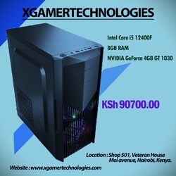 SPECS: PROCESSOR: 12th Generation Intel Core i5 12400F upto 4.4ghz 6-Core 12-Thread Desktop Processor / FANS and HEATSINKS: Intel Fan for corei7_I5_I3 sockets LGA 1155_1150_1151_1200_1700 / MOTHERBOARDS: H610M D4 LGA1700 12th gen Gaming Desktop Motherboard / RAM :8GB DDR4 Desktop Ram { brand new } / GRAPHICS CARDS: NVIDIA GeForce 4GB GT 1030 Graphics Card / POWER SUPPLIES: 550 WATTS 80plus bronze Gaming Power Supply / SSD: 256GB OEM solid state drive { brand new SSD } for Desktop and Laptop / COMPUTER CASINGS: Evesky Gaming Mid Tower Computer Casing / 1 Year XGAMERtechnologies Guarantee.