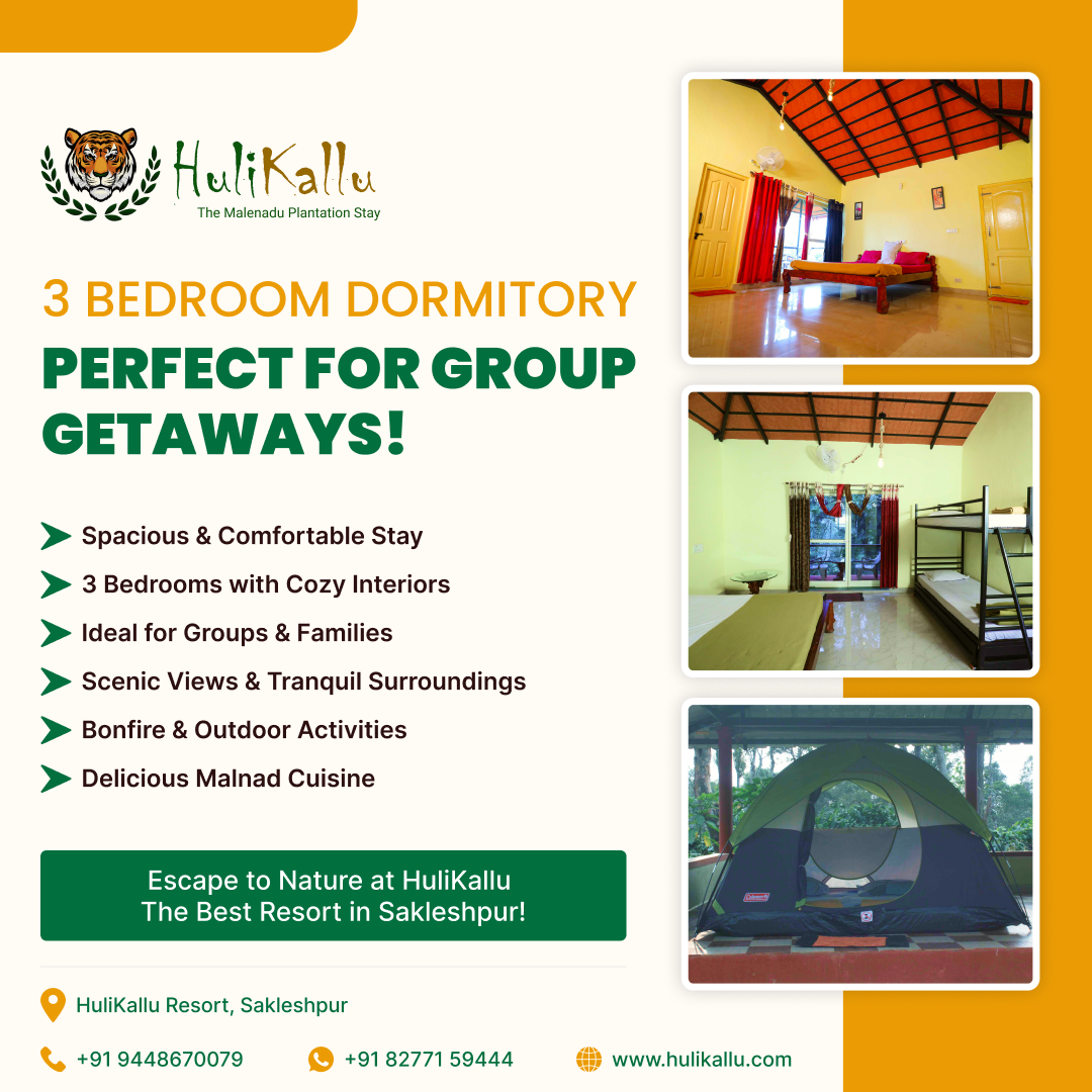 Looking for a comfortable and spacious stay for your group or family? The 3-bedroom dormitory at HuliKallu Resort in Sakleshpur offers the ideal blend of comfort, nature, and adventure. Nestled in the serene Western Ghats, this dormitory is perfect for large families, corporate teams, and friends seeking a relaxing retreat.