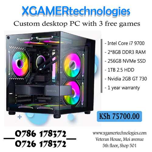 FEATURES: PROCESSOR: 9th Generation Intel Core i7 9700 upto 4.7GHz 8Core_8Threaded LGA1151 Processor for desktop / FANS and HEATSINKS: Stock like desktop led fan lga775 115x 1700 and 1366 molex 4pin heatsink / MOTHERBOARDS: H310M 8_9th Generation Gaming Desktop Motherboard / RAM: 2pc * 8GB DDR3 Desktop RAM { brand new } / COMPUTER CASINGS: Century Gaming Mid Tower M_ATX Computer Casing with glass front and side / CASE FAN: 3pc * 120MM Multi Color RGB CASE FAN {PWM and Molex} / GRAPHICS CARDS: Nvidia 2GB GT 730 Graphics card / POWER SUPPLIES: 550 WATTS 80plus bronze Gaming Power Supply / HARD DISKS: 1TB Desktop internal 7200rpm Hard drive / SSD: 256GB OEM Nvme solid state drive { brand new SSD } for Desktop and Laptop / WIFI and Bluetooth: 600Mbps WiFi Bluetooth v5 Wireless USB Dual Band Dongle / / 1 Year XGAMERtechnologies Guarantee. Price: 75,700.00 KES