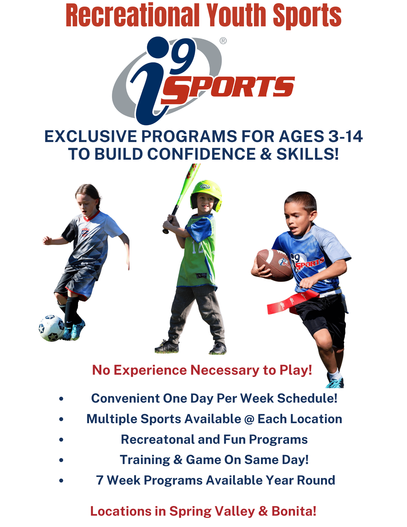 We offer fun, safe, and convenient youth sports leagues for boys and girls ages 3–13 in Spring Valley, Bonita, and North Park. Our programs include Soccer, Flag Football, T-Ball/Baseball, Basketball, and Multi-Sport options. With a one-day-a-week format, we make it easy for busy families to get involved in sports without the extra time commitment.