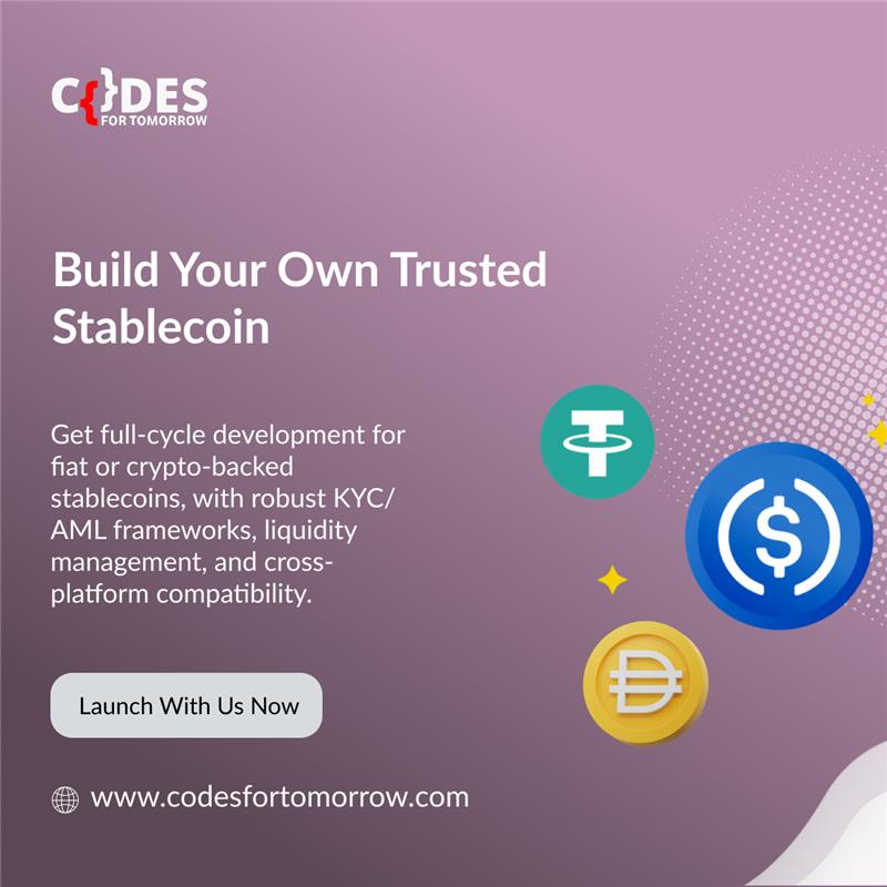 Planning to build a stablecoin that’s secure, compliant, and ready to scale? At Codes For Tomorrow, we offer end-to-end stablecoin development services—from selecting the ideal model (fiat, crypto, commodity, or algorithmic) to developing secure smart contracts, managing liquidity, and following regulations. Whether you're just starting or looking to grow, we simplify the journey with fast and scalable solutions built for the real world.