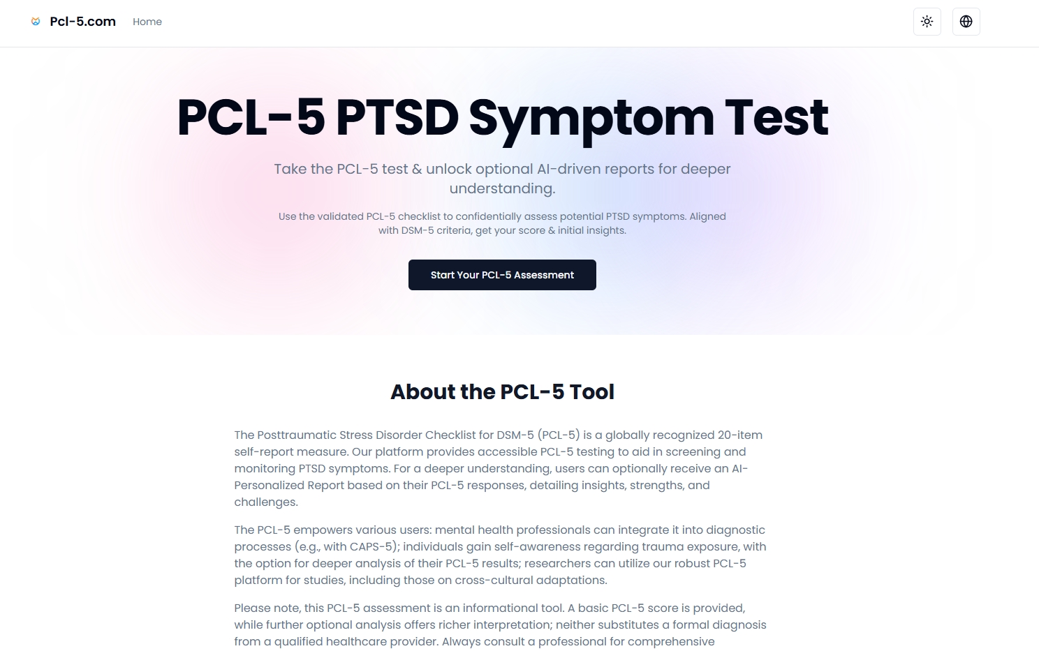 PCL-5.com offers the official PCL-5 PTSD checklist. Securely assess DSM-5 symptoms, get your score, and gain insights. Ideal for professional use & personal understanding. Start your confidential PCL-5 test now!PCL-5.com offers the official PCL-5 PTSD checklist. Securely assess DSM-5 symptoms, get your score, and gain insights. Ideal for professional use & personal understanding. Start your confidential PCL-5 test now!