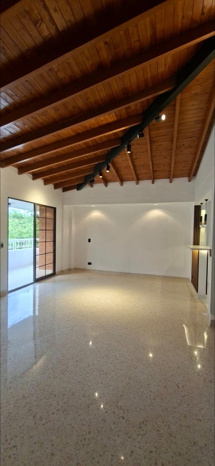 Inside, the apartment feels warm and inviting thanks to its gorgeous wooden ceilings, generous layout, and abundant natural light throughout.