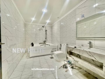 Spacious duplex for rent in Hateen, Kuwait, featuring a ground floor and basement layout. The ground floor offers a large living room, huge kitchen, guest toilet, and three bedrooms including two master suites. The basement includes a spacious hall, laundry room, maid’s and driver’s rooms, plus two additional bedrooms. Enjoy a large courtyard, shaded parking, and central heating.