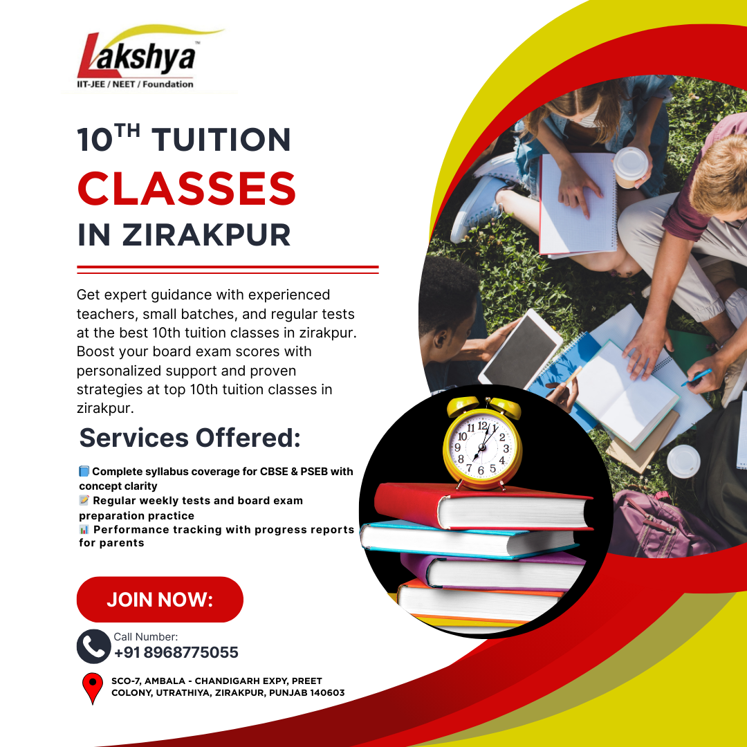 If you are searching for the best 10th tuition classes in Zirakpur, our institute provides simple and effective coaching to help students score well in their board exams. Our experienced teachers give personal attention in small batches and make sure students clearly understand subjects like Maths, Science, English, and Social Studies as per the latest CBSE and PSEB syllabus. We conduct regular tests, clear doubts on time, and follow proper revision plans to improve confidence and marks. Our 10th tuition classes in Zirakpur offer a friendly and supportive learning environment that helps students build strong basics and prepare well for higher studies. For more details contact us +91 8968775055. Keywords: