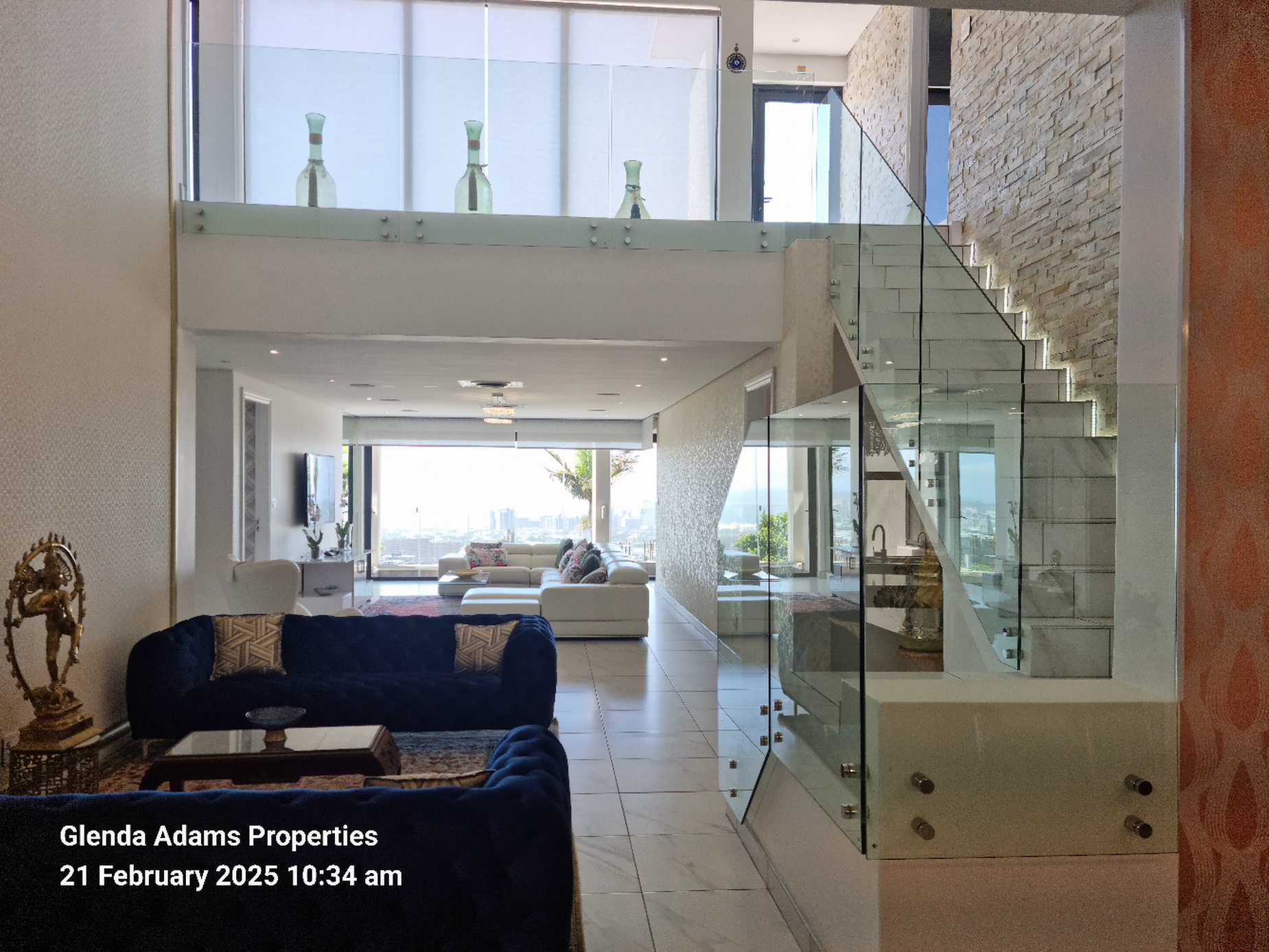 A striking glass and wrought-iron pivot door welcomes you into an interior defined by architectural scale, natural light, and uninterrupted panoramic views stretching across the ocean, city skyline, and the iconic Moses Madiba Stadium. From sunrise over the Indian Ocean to ships passing through the harbour, the outlook is simply extraordinary. Designed for refined, contemporary living, the home spans approximately 400m² of thoughtfully curated space. High ceilings and seamless flow enhance the sense of openness, with bespoke imported finishes and statement lighting sourced from Europe and the United States elevate the aesthetics to international standards. The open-plan kitchen is both sculptural and functional — centred around a statement island and finished with premium Caesarstone and duco surfaces, integrated appliances, and custom cabinetry. It connects effortlessly to expansive reception areas and open plan dining room and lounge, creating an ideal balance between sophisticated entertaining and relaxed family living. Customised furnishing come with this magnificent property Accommodation comprises four generously proportioned bedrooms, each with its own beautifully appointed en-suite bathroom. The primary suite is positioned for maximum privacy and view, complete with a spa-inspired bathroom featuring a soaking tub, double rain showers, and private balcony access — a tranquil retreat Crowning the residence is an expansive roof top entertainment, with a vast open plan sky lounge designed for elevated living. Framed overlooking city skylines, uninterrupted panoramic views stretching across the ocean, city skyline and harbour
