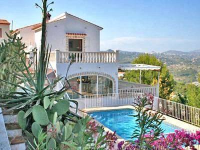 Calpe - Nice family residence situated in a quiet raised position with fantastic open sea, Peñon and mountain views. The villa had been partly refurbished to a high standard, providing on the upper level a fresh master bedroom with panoramic terrace, 2 further double bedrooms and 1 bathroom. The lower level offers new modern kitchen, reception room, cosy TV/sitting room with cassette chimney, sunny glazed in terrace used as dining room and a pleasant open terrace with beautiful coast line views. The easy to maintained terrace garden has Mediterranean palm trees and colourful flowers and incorporates an attractive 8 x 4 swimming pool. The large private gated plot has a paved drive way to the close garage and the useful store room. The villa benefits from gas central heating. Villa 170m2. Plot 1068m2