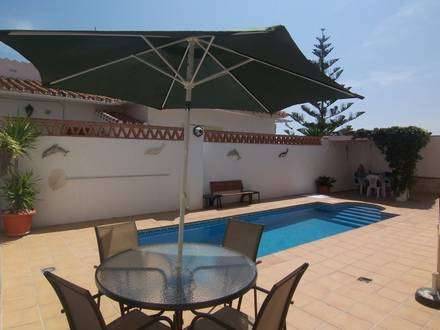 Entry to the property is by private gate into a large front courtyard. The house has a main double door leading to a hall, office/study (or 4th bedroom), utility room with sink, washing machine and tumble dryer, and a large, modern kitchen fitted with granite worktops, ceramic hob, dishwasher etc. From here there is direct access to the outside terrace. Further double doors open to the lounge-dining room with air conditioning, feature fireplace and patio doors to the pool area. There is also a cloakroom and access to the garage. Upstairs are 3 good sized bedrooms all with en-suite bathrooms and built-in wardrobes. Each bedroom has patio doors leading to individual terraces with sea or mountain views. The master bedroom has air conditioning. The house has full gas central heating, double glazing, a tiled garage, satellite TV, security grilles on all doors and windows and is surrounded by a 2 metre wall. The outside is fully terraced with a pergola, flower beds, garden shed, automatic watering system and a fully tiled pool.