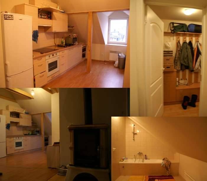 For sale: attic 3-room apartment in a four-apartment house. A useful area of 58.93 m2, additional area of 25 m2 (from 1 m to 1.6 m height). The apartment is newly renovated, equipped with fire and security alarm, heating to electricity or modern fireplace, heated bathroom floors. Convenient public transport connections with other urban districts. (It is possibility to buy the whole house. The first floor is commercial space). Price 95.600 EUR.